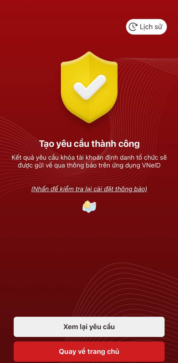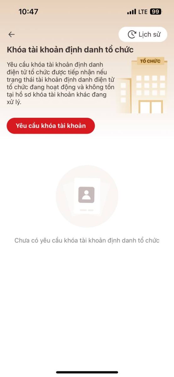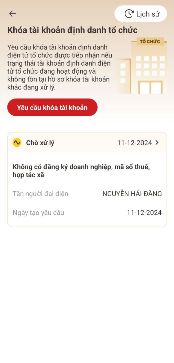 2. Lịch sử yêu cầu khóa tài khoản định danh tổ chức
