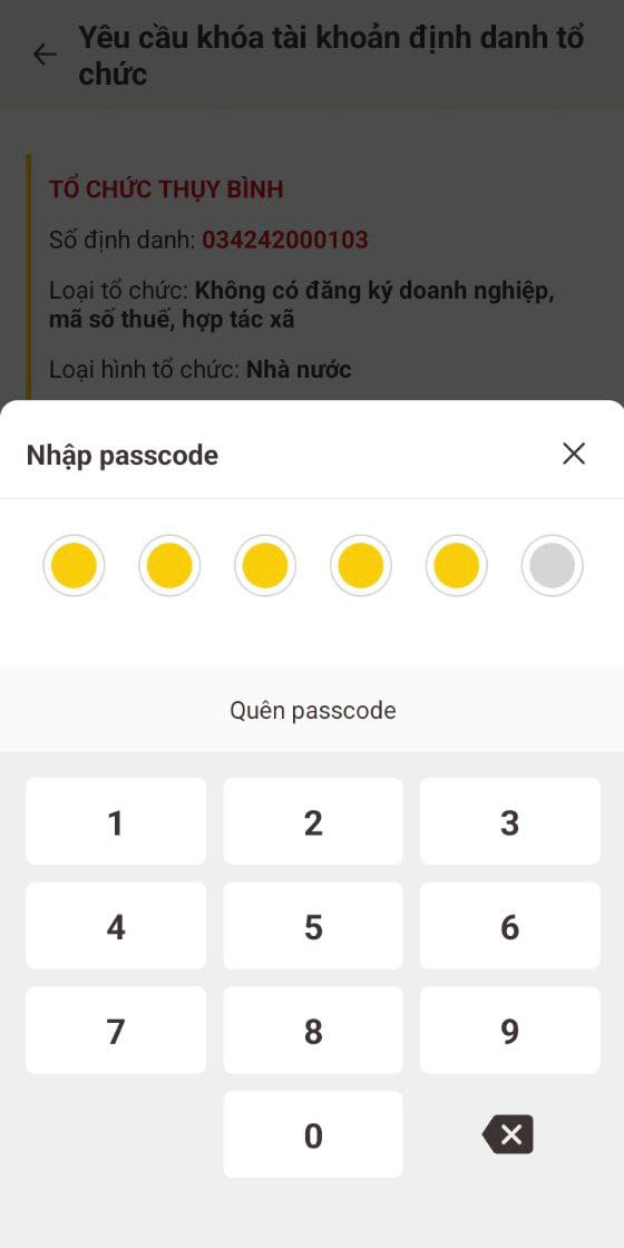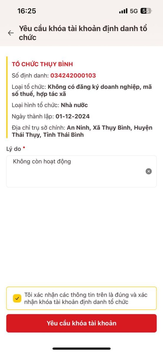 Tại màn Khóa tài khoản định danh tổ chức, nhấn