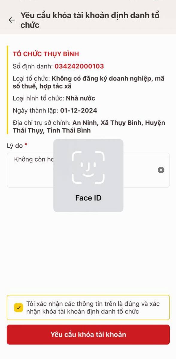 * Mục đích: Chức năng cho phép người đại diện tổ chức tạo yêu cầu khóa tài khoản định danh tổ chức