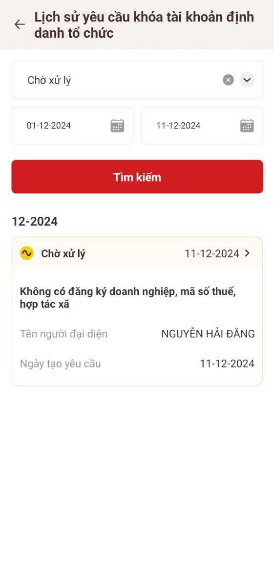 * Mục đích: Giúp công dân tìm kiếm và xem chi tiết lịch sử yêu cầu khóa tài khoản định danh tổ chức.