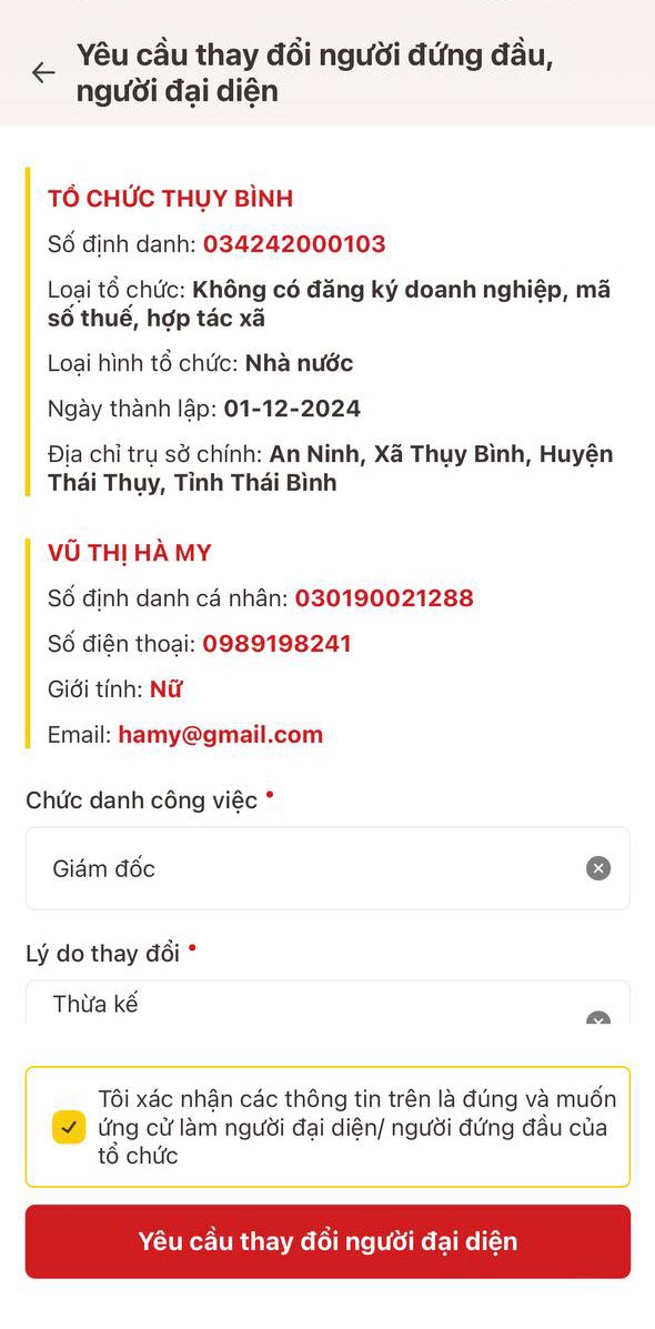 - Nhấn Yêu cầu thay đổi người đại diện