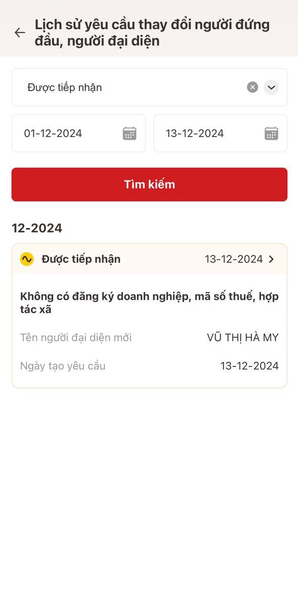 • Nhấn vào hồ sơ bất kỳ trong danh sách lịch sử yêu cầu thay đổi người đứng đầu, người đại diện cần xem chi tiết