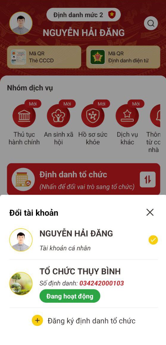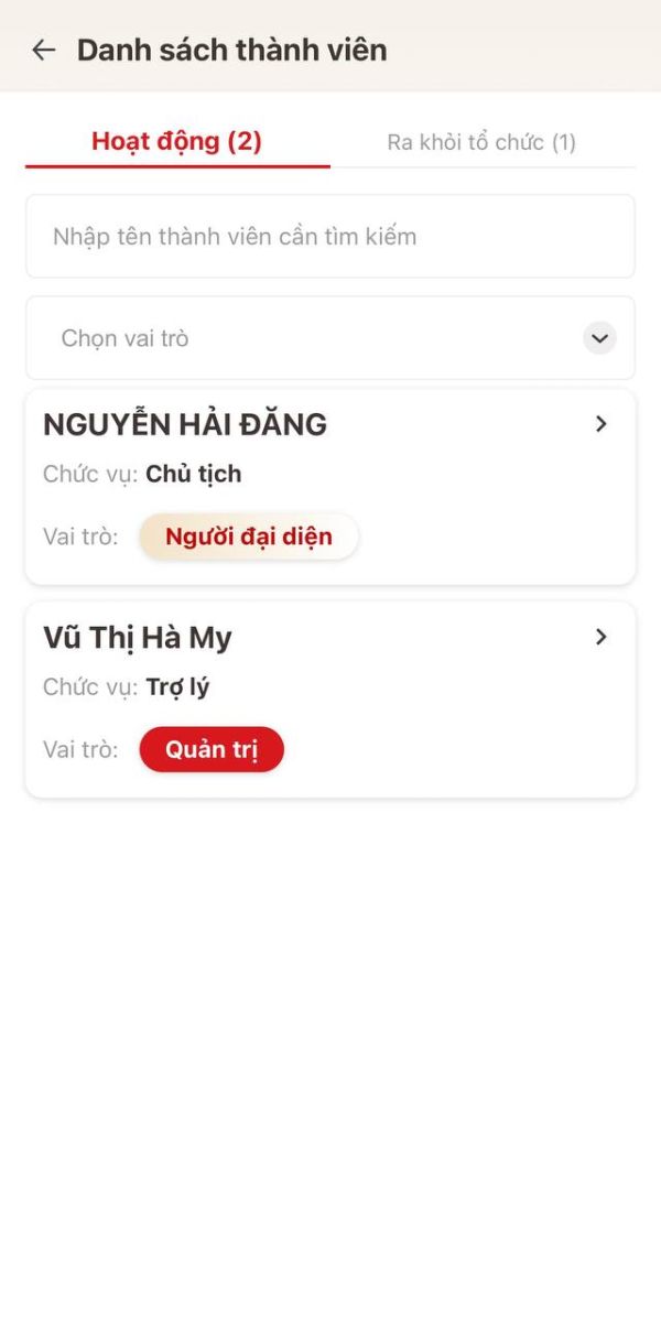 - Tại màn Đổi tài khoản, chọn tổ chức cần xóa thành viên