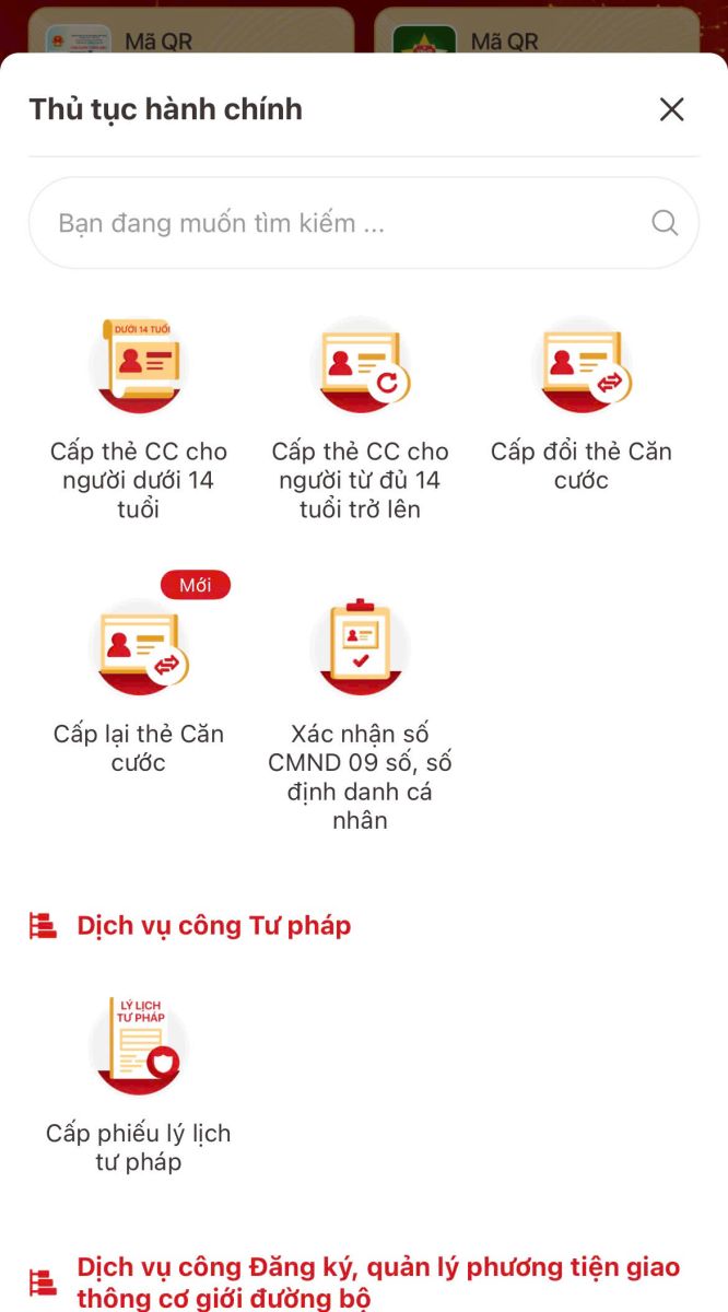 Bước 1: Từ giao diện chính của ứng dụng VNeID, chọn "Thủ tục hành chính", sau đó tìm đến mục "Cấp, quản lý căn cước" và nhấn vào một trong những chức năng cần thực hiện.