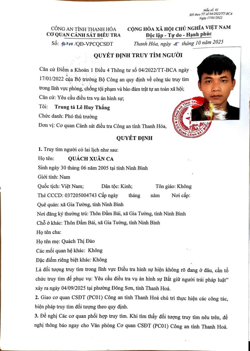 Cơ quan CSĐT Công an tỉnh Thanh Hóa đang điều tra vụ án" Bắt giữ người trái pháp luật" xảy ra  ngày 04/09/2025 tại phường Đông Sơn, tỉnh Thanh Hóa Quá trình điều tra Quách Xuân Ca là đối tượng có liên quan trong vụ án không có mặt tại địa phương, hiện không rõ đang ở đâu cần tổ chức truy tìm để phục vụ yêu cầu điều tra