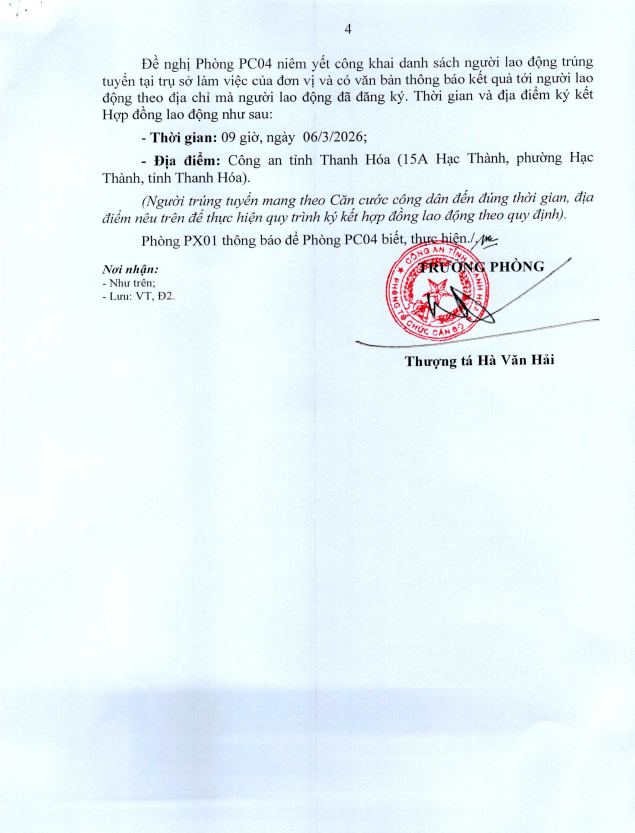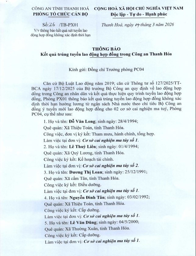 Thông báo kết quả xét tuyển lao động hợp đồng không xác định thời hạn