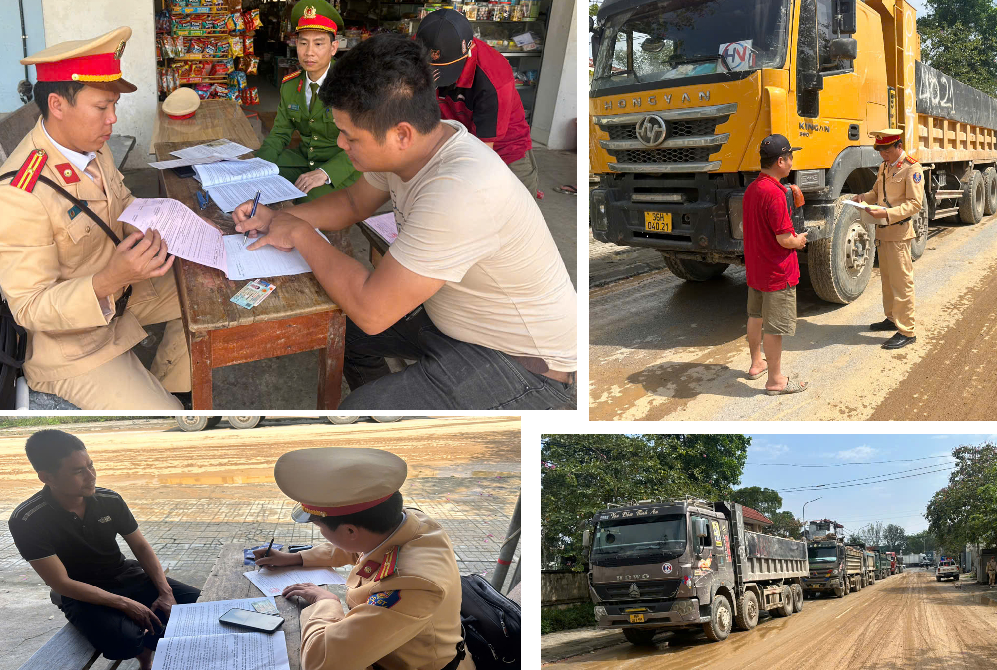 Các trường hợp trên vi phạm quy định tại điểm a, b khoản 2 Điều 17 Nghị định 168/2024/NĐ-CP ngày 27/12/2024 của Chính phủ về xử phạt vi phạm hành chính trong lĩnh vực giao thông đường bộ. Tổng số tiền xử phạt đối với 4 trường hợp là 12.000.000 đồng, đồng thời buộc thu dọn toàn bộ bùn đất rơi vãi trên mặt đường.