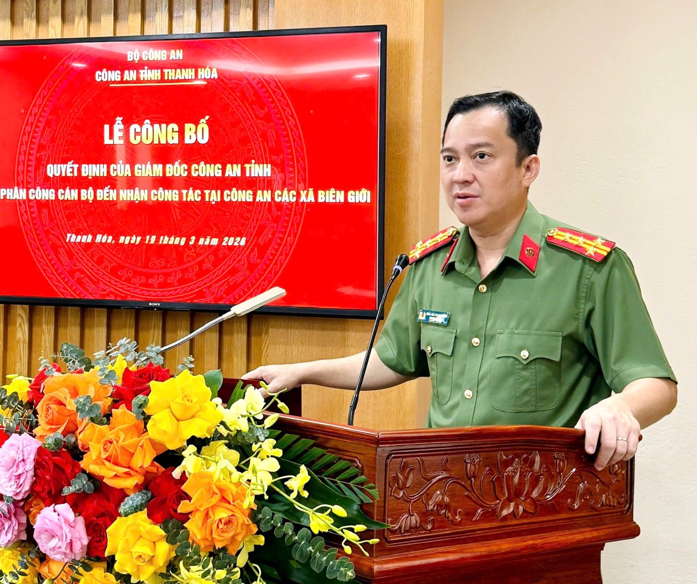 Sáng 19/3/2026, Đại tá Trần Thái Quang Hoàng, Phó Giám đốc Công an tỉnh Thanh Hoá đã chủ trì Lễ công bố quyết định của Giám đốc Công an tỉnh về việc điều động, phân công cán bộ đang công tác tại các đơn vị trực thuộc Bộ Công an tăng cường về công tác tại Công an các xã biên giới trên địa bàn tỉnh Thanh Hóa...
