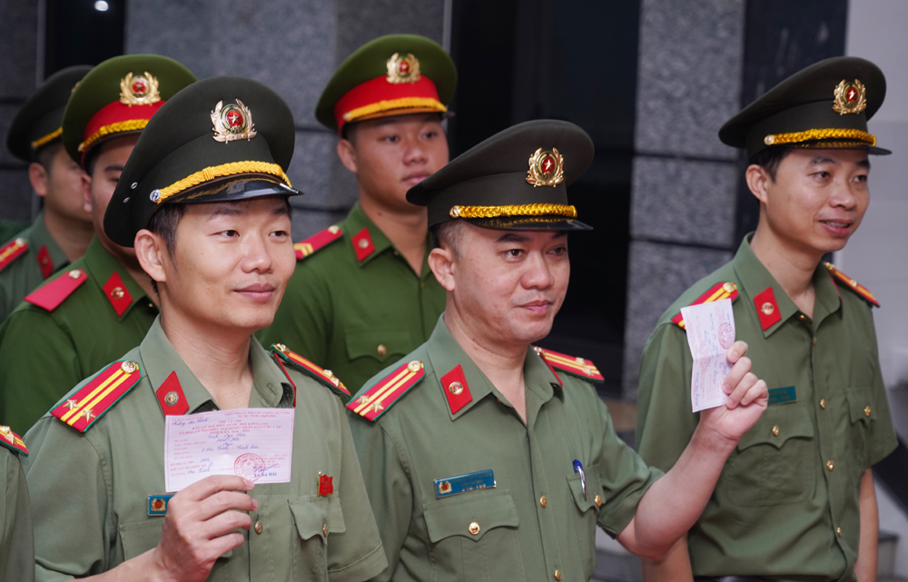 Hình ảnh những cán bộ, chiến sĩ Công an trong sắc phục chỉnh tề, nghiêm túc thực hiện quyền bầu cử không chỉ góp phần tạo nên khí thế trang nghiêm tại khu vực bỏ phiếu, mà còn thể hiện quyết tâm của lực lượng Công an trong việc chung sức, đồng lòng xây dựng Nhà nước pháp quyền xã hội chủ nghĩa, vì sự phát triển bền vững của đất nước và của tỉnh Thanh Hóa.