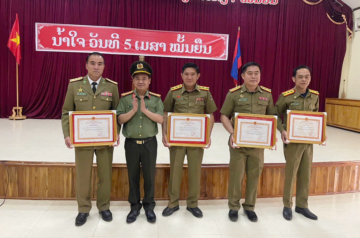 Đại tá Lê Ngọc Anh trao Giấy khen của Giám đốc Công an tỉnh Thanh Hóa cho các tập thể, cá nhân thuộc Công an tỉnh Hủa Phăn