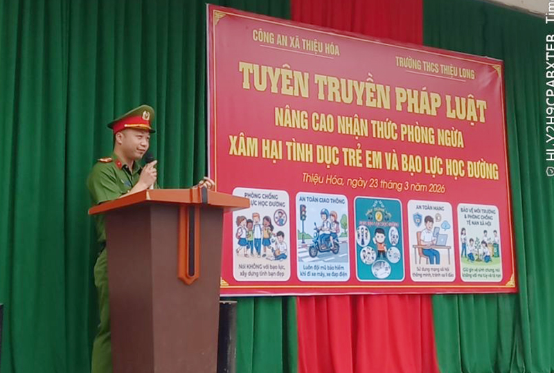 Sáng 23/3/2026, Công an xã Thiệu Hóa phối hợp với Trường THCS Thiệu Long tổ chức buổi tuyên truyền, giáo dục pháp luật với chuyên đề: “Phòng, chống xâm hại tình dục; phòng ngừa hành vi giao cấu với người từ đủ 13 đến dưới 16 tuổi và phòng, chống bạo lực học đường” cho hơn 400 học sinh và cán bộ, giáo viên nhà trường.
