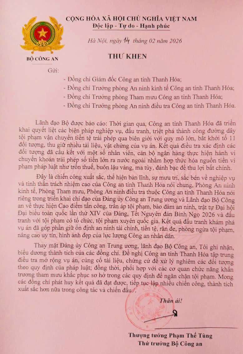 Ngày 14/02/2026, Thượng tướng Phạm Thế Tùng, Thứ trưởng Bộ Công an đã có thư khen gửi Giám đốc Công an tỉnh Thanh Hoá; đồng chí Trưởng phòng An ninh kinh tế Công an tỉnh Thanh Hoá; đồng chí Trưởng phòng Tham mưu Công an tỉnh Thanh Hoá; đồng chí Trưởng phòng An ninh điều tra Công an tỉnh Thanh Hoá đã triển khai quyết liệt các biện pháp nghiệp vụ, đấu tranh, triệt phá thành công đường dây tội phạm vận chuyển tiền tệ trái phép qua biên giới với quy mô lớn, bắt khởi tố 11 đối tượng, thu giữ nhiều tài liệu, vật chứng của vụ án…