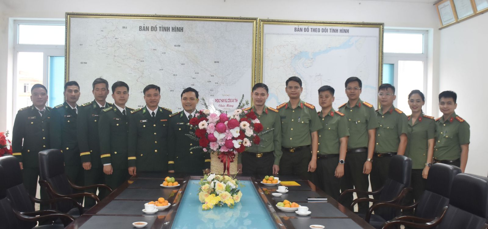 Đại diện lãnh đạo Phòng Tham mưu Công an tỉnh tặng hoa chúc mừng Phòng Tham mưu Bộ đội Biên phòng tỉnh