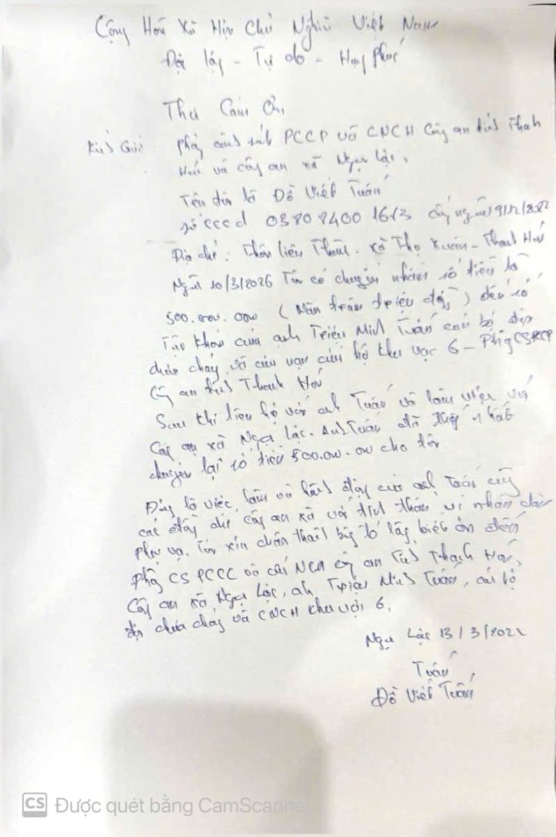 Chiều 13/3/2026, tại trụ sở Công an xã Ngọc Lặc, tỉnh Thanh Hóa, đồng chí Triệu Minh Tuấn, cán bộ Đội Chữa cháy và CNCH khu vực 6, Phòng Cảnh sát PCCC và CNCH, Công an tỉnh Thanh Hóa đã bàn giao, trao trả số tiền 500 triệu đồng do người dân chuyển nhầm vào tài khoản cá nhân. Việc bàn giao được thực hiện với sự chứng kiến của đại diện chỉ huy đơn vị, Công an xã Ngọc Lặc, Ngân hàng Agribank chi nhánh Thọ Xuân và người chuyển tiền nhầm.