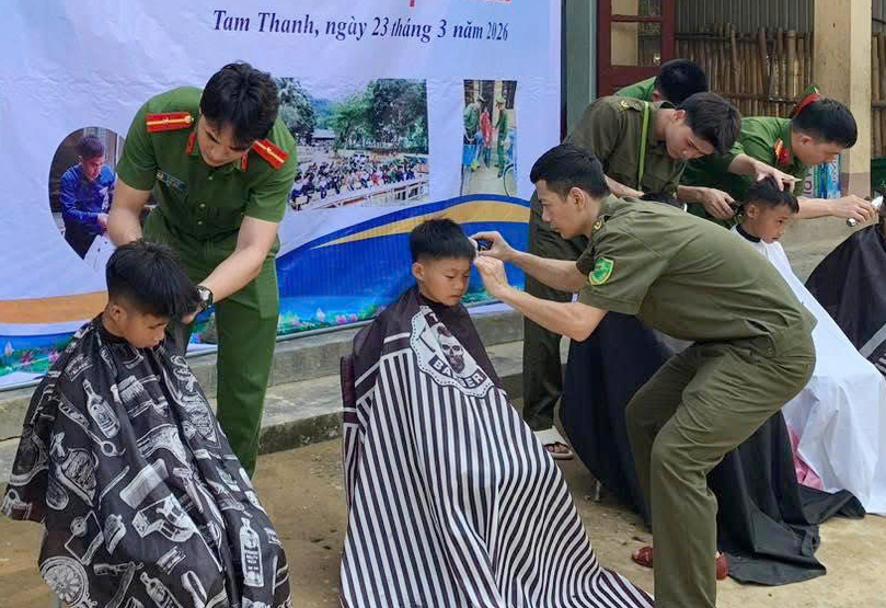 Hướng tới kỷ niệm 95 năm Ngày thành lập Đoàn Thanh niên Cộng sản Hồ Chí Minh (26/3/1931 - 26/3/2026), sáng 23/3/2026, Chi đoàn Công an xã Tam Thanh đã phối hợp với Trường Tiểu học Tam Thanh tổ chức chương trình “Cắt tóc miễn phí - Lan toả yêu thương” cho học sinh tại điểm trường Cha Lung.