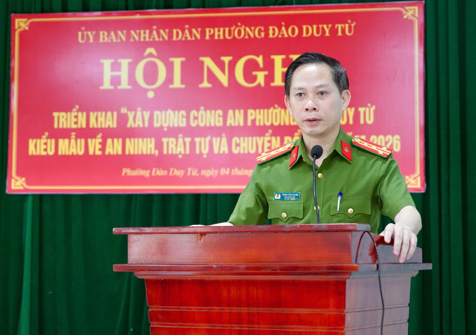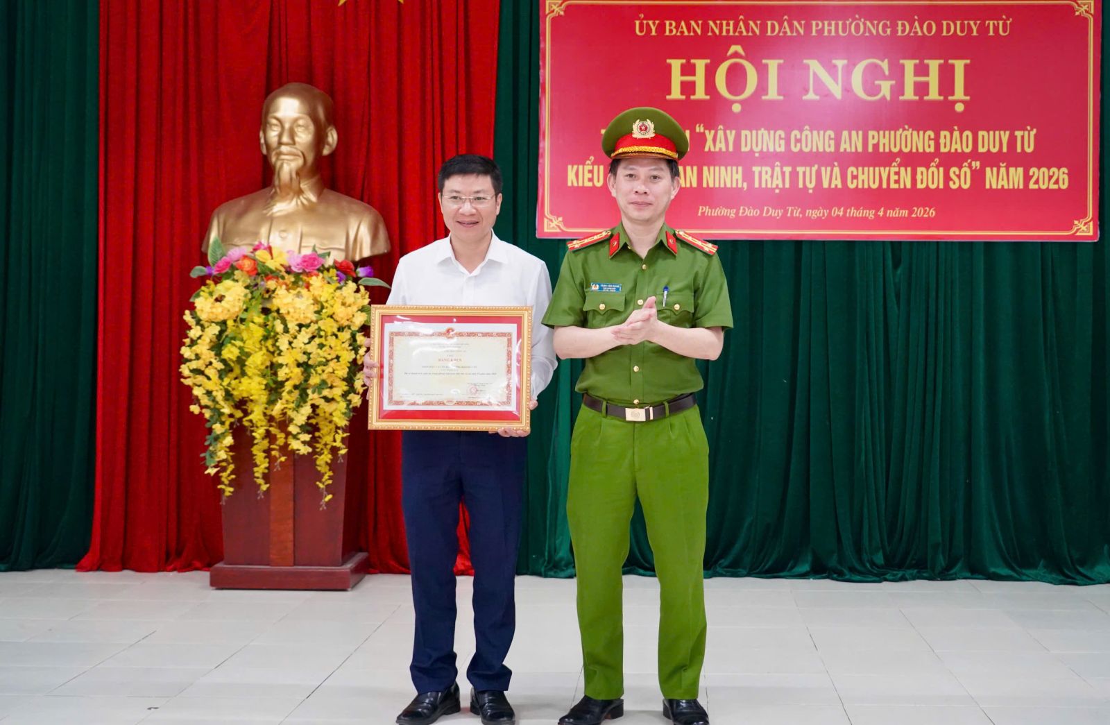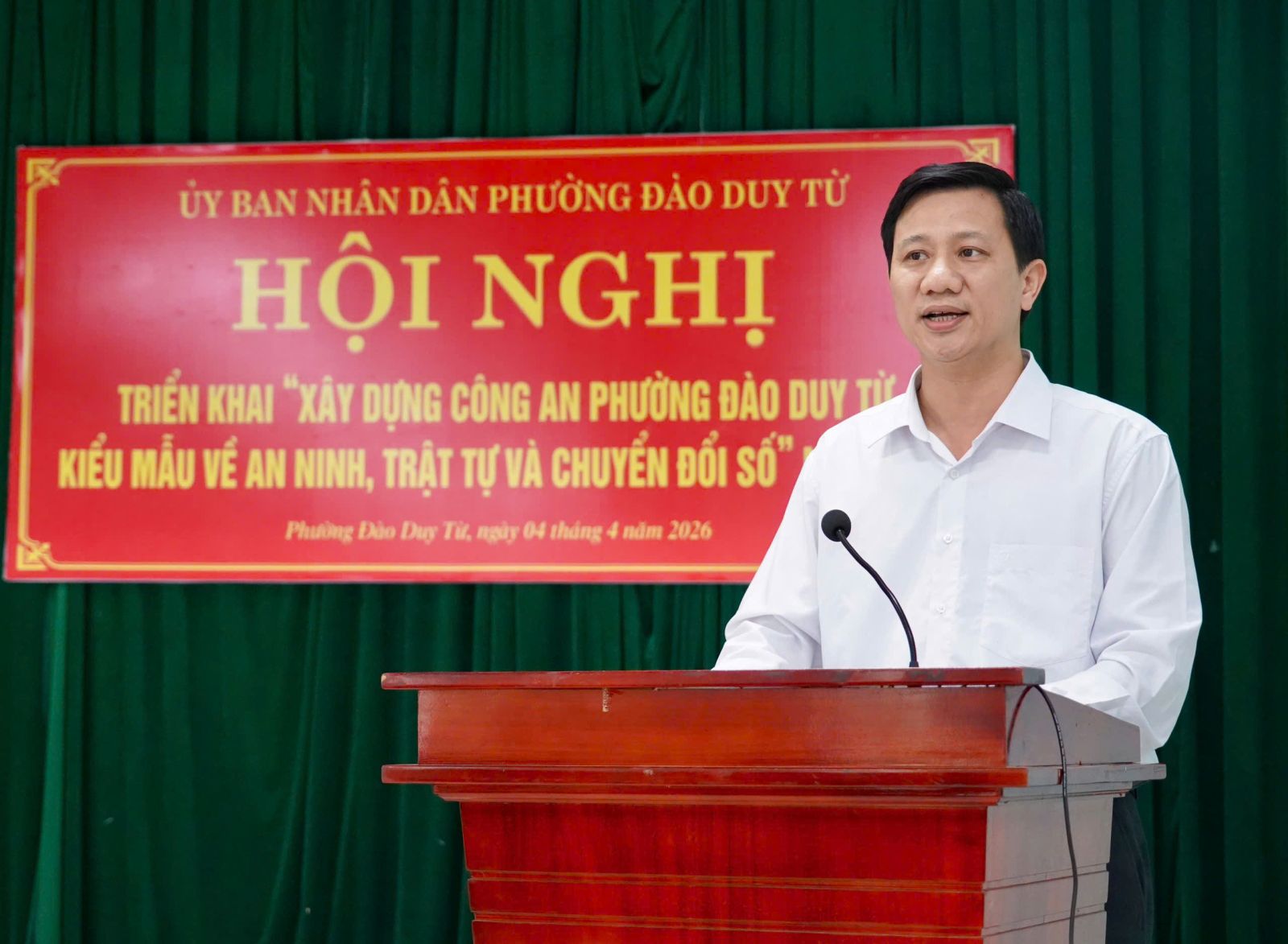 Chiều 07/4/2026, UBND phường Đào Duy Từ tổ chức hội nghị triển khai xây dựng Công an phường kiểu mẫu về an ninh, trật tự (ANTT) và chuyển đổi số. Dự và chỉ đạo hội nghị có Đại tá Trịnh Văn Giang, Phó Giám đốc Công an tỉnh, đại diện lãnh đạo các phòng nghiệp vụ Công an tỉnh...Về phía cấp ủy, chính quyền địa phương có các đồng chí trong Thường trực Đảng ủy phường; lãnh đạo HĐND, UBND phường; Chủ tịch Ủy ban MTTQ cùng đại diện các ban, ngành, đoàn thể chính trị - xã hội. Ngoài ra còn có bí thư chi bộ, tổ trưởng Tổ an ninh trật tự ở cơ sở, đại diện các cơ quan, đơn vị, trường học, trạm y tế đóng trên địa bàn phường Đào Duy Từ.