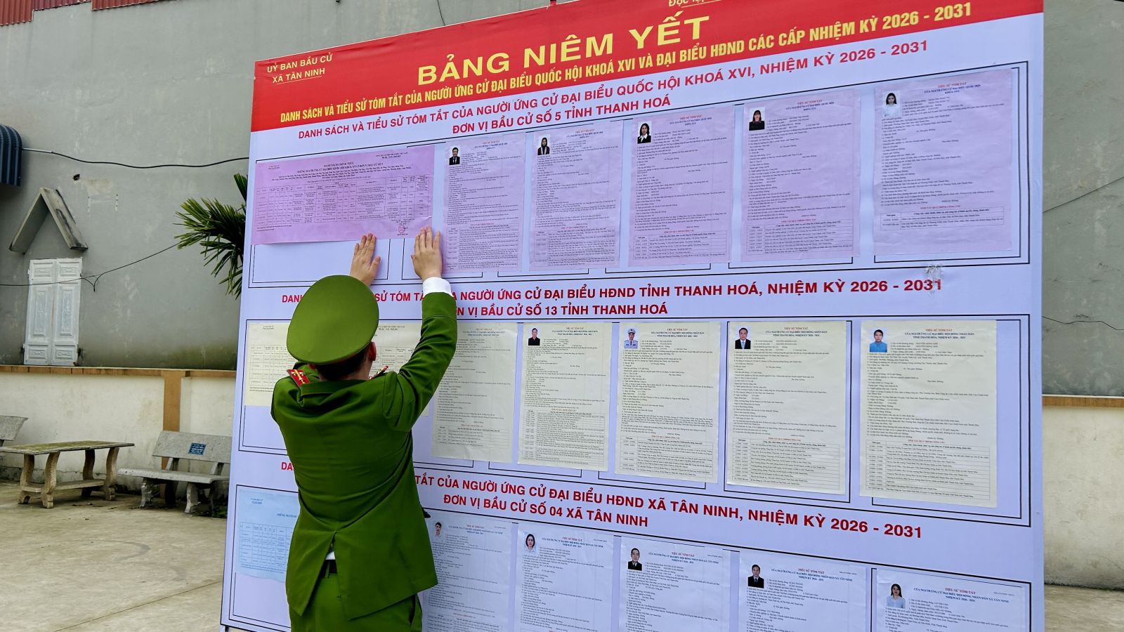 Công an xã Tân Ninh tham gia dán dán sách người được ứng cử đại biểu Quốc hội và đại biểu Hội đồng nhân dân các cấp nhiệm kỳ 2026-2031 tại khu vực điểm bỏ phiếu