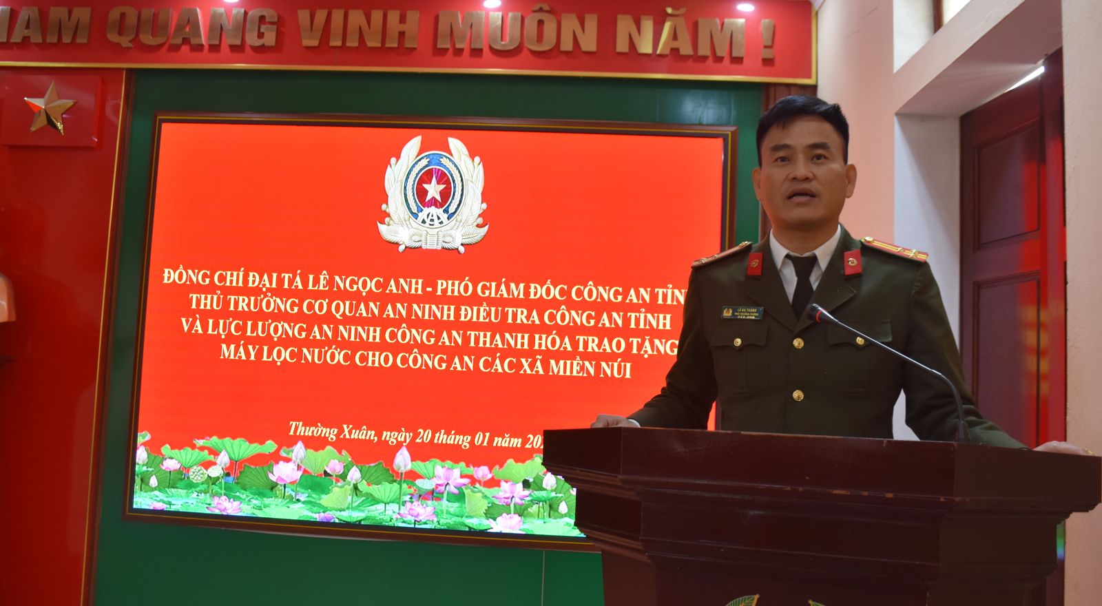 Với mục tiêu hướng về lực lượng Công an các xã miền núi, biên giới - nơi tuyến đầu bảo vệ an ninh, trật tự (ANTT), thực hiện ý kiến chỉ đạo của đồng chí Giám đốc và đồng chí Phó Giám đốc - Thủ trưởng Cơ quan An ninh điều tra Công an tỉnh, sáng 20/01/2026, Phòng An ninh kinh tế phối hợp với Phòng nghiệp vụ Công an tỉnh trực tiếp đến thăm, trao tặng máy lọc nước cho Công an 7 xã biên giới, gồm: Thường Xuân, Vạn Xuân, Bát Mọt, Luận Thành, Thắng Lộc, Xuân Chinh và Yên Nhân…