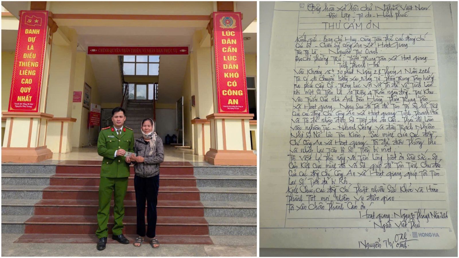 Xúc động khi nhận lại tài sản, bà Nguyễn Thị Oanh đã viết thư cảm ơn gửi đến Công an xã Hoạt Giang. Bà cho biết đây là số tiền lớn đối với gia đình và trân trọng cảm ơn thái độ làm việc nghiêm túc, nhanh chóng và đầy trách nhiệm cùng sự tận tình, chu đáo của cán bộ, chiến sĩ Công an xã Hoạt Giang đã nhanh chóng tìm và trao trả lại cho bà số tiền đã đánh rơi.