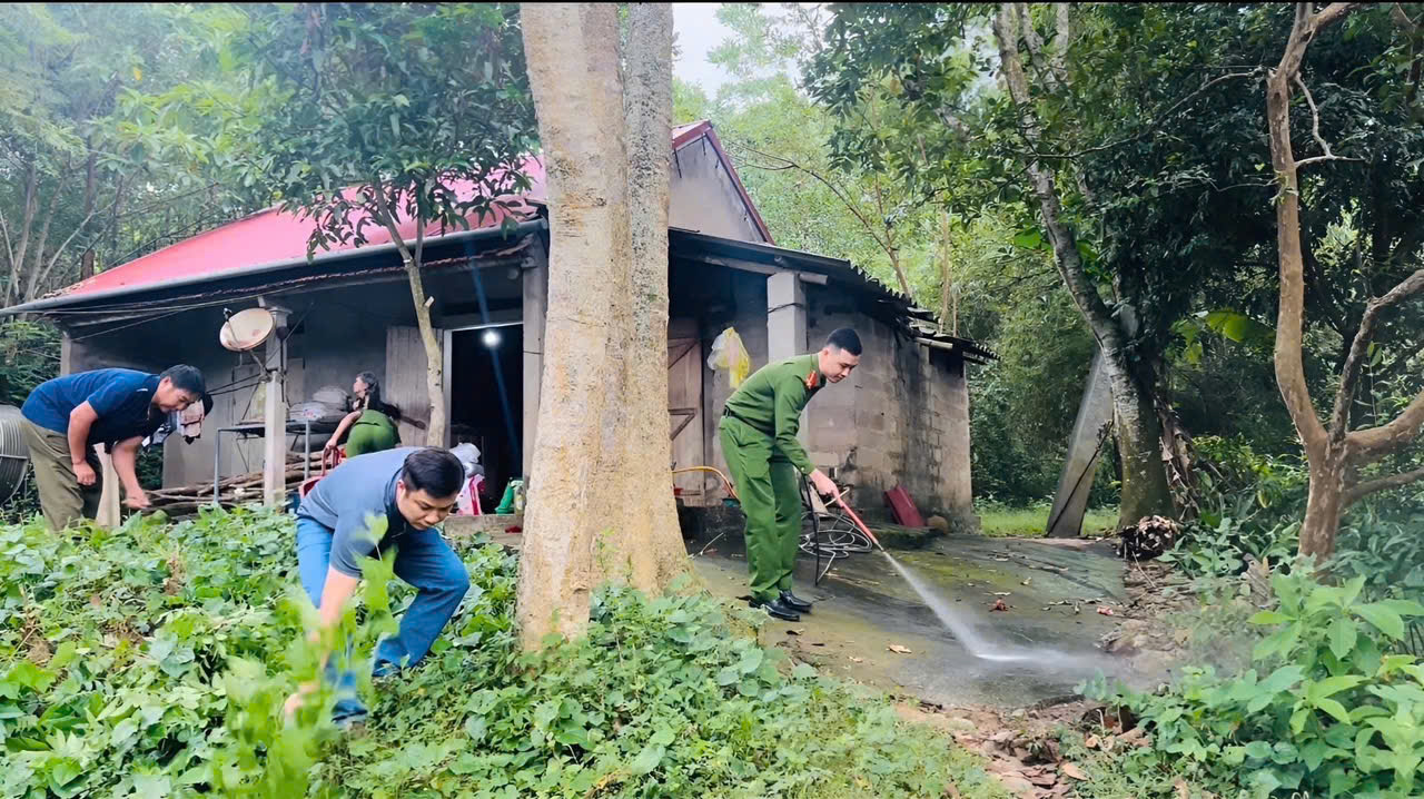 Cán bộ, chiến sĩ Công an xã Vân Du giúp bà Hồng dọn dẹp nhà cửa, vệ sinh sân vườn