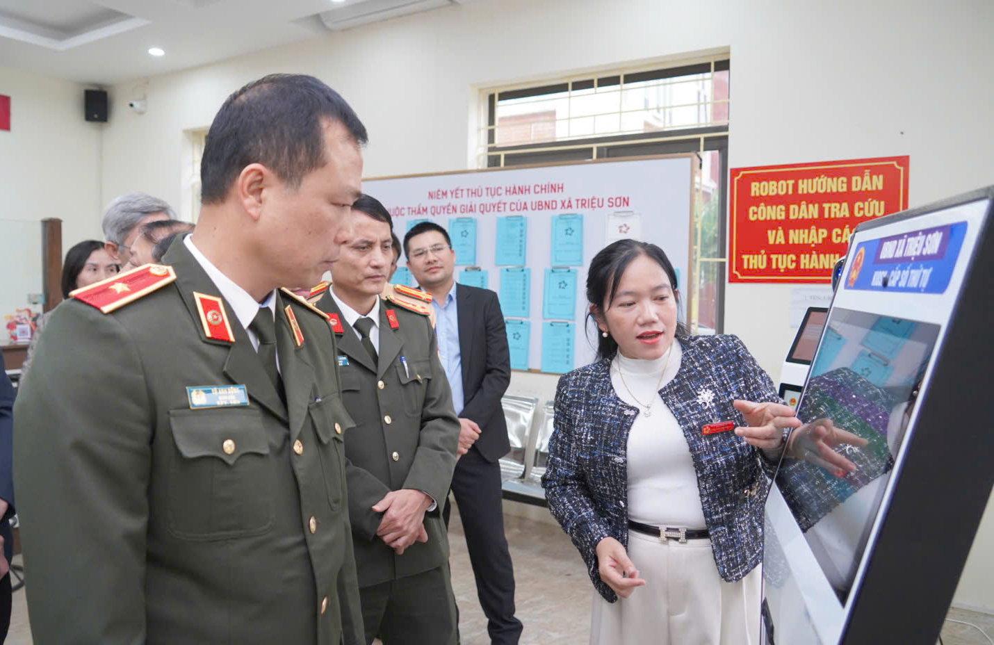 Đến nay, tại Trung tâm Phục vụ hành chính công, xã Triệu Sơn đã đưa hệ thống Robot AI vào hướng dẫn thủ tục hành chính, hệ thống máy lấy số xếp hàng tự động... Đồng thời, triển khai thí điểm Robot lễ tân thông minh phục vụ giải quyết thủ tục hành chính cho người dân tại 7/47 thôn trên địa bàn; triển khai phòng họp trực tuyến từ xã kết nối đến thôn; đầu tư, trang bị hệ thống camera AI tại 7/47 thôn giám sát ANTT để phục vụ công tác quản lý, bảo đảm an ninh, an toàn về trật tự xã hội; tập huấn kiến thức, kỹ năng số cho cán bộ, đảng viên, công chức, viên chức, đại diện các thôn trên địa bàn...