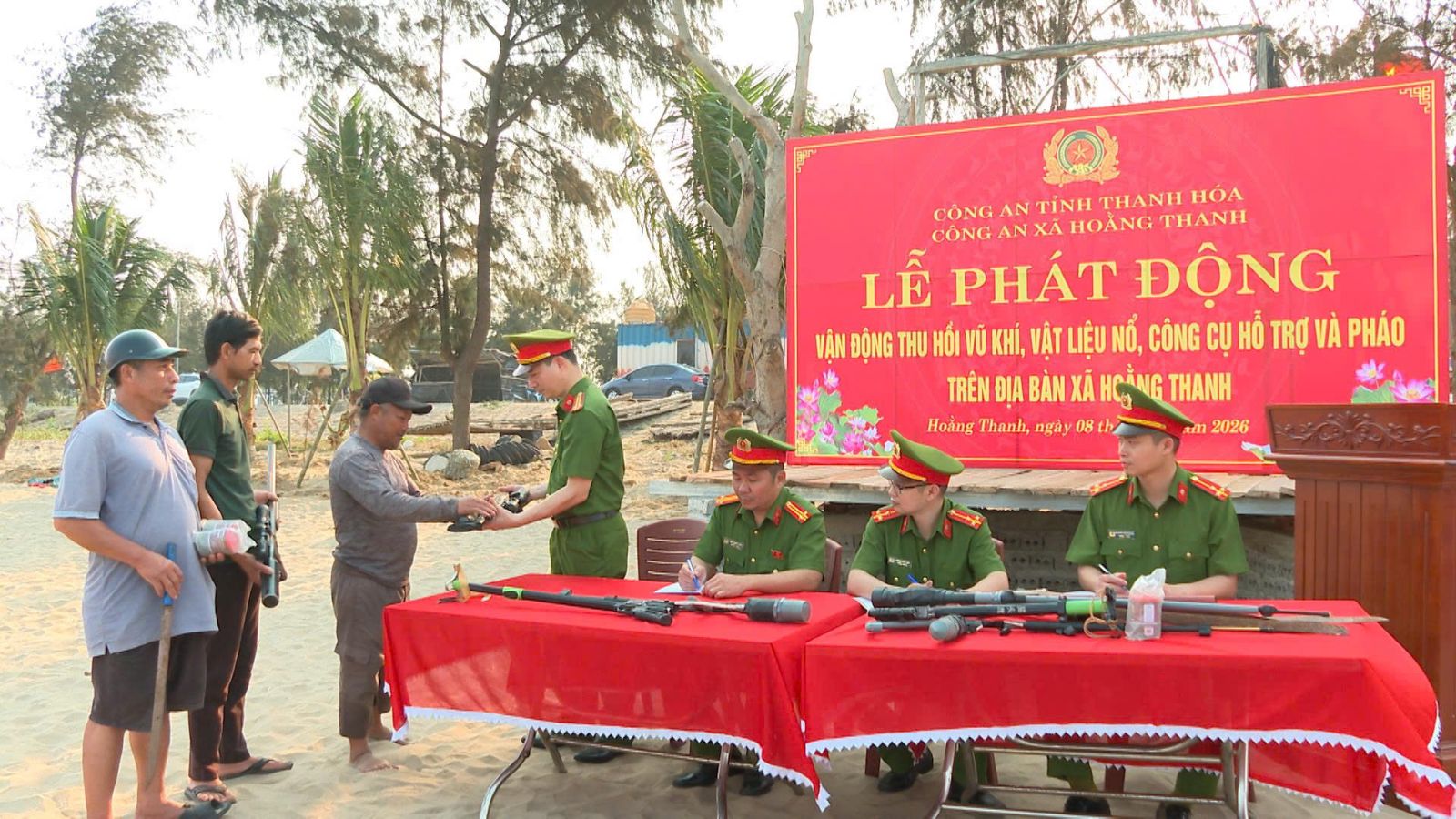 3 khẩu súng các loại, 6 vũ khí thô sơ, 1,5 kg pháo và nhiều công cụ hỗ trợ khác đã được bà con ngư dân xã Hoằng Thanh tự nguyện giao nộp ngay sau Lễ phát động vận động, thu hồi vũ khí, vật liệu nổ, công cụ hỗ trợ và pháo do Công an xã tổ chức vào chiều 08/4/2026. Đây là kết quả thể hiện sự chuyển biến mạnh mẽ trong nhận thức của người dân vùng biển về an ninh trật tự.