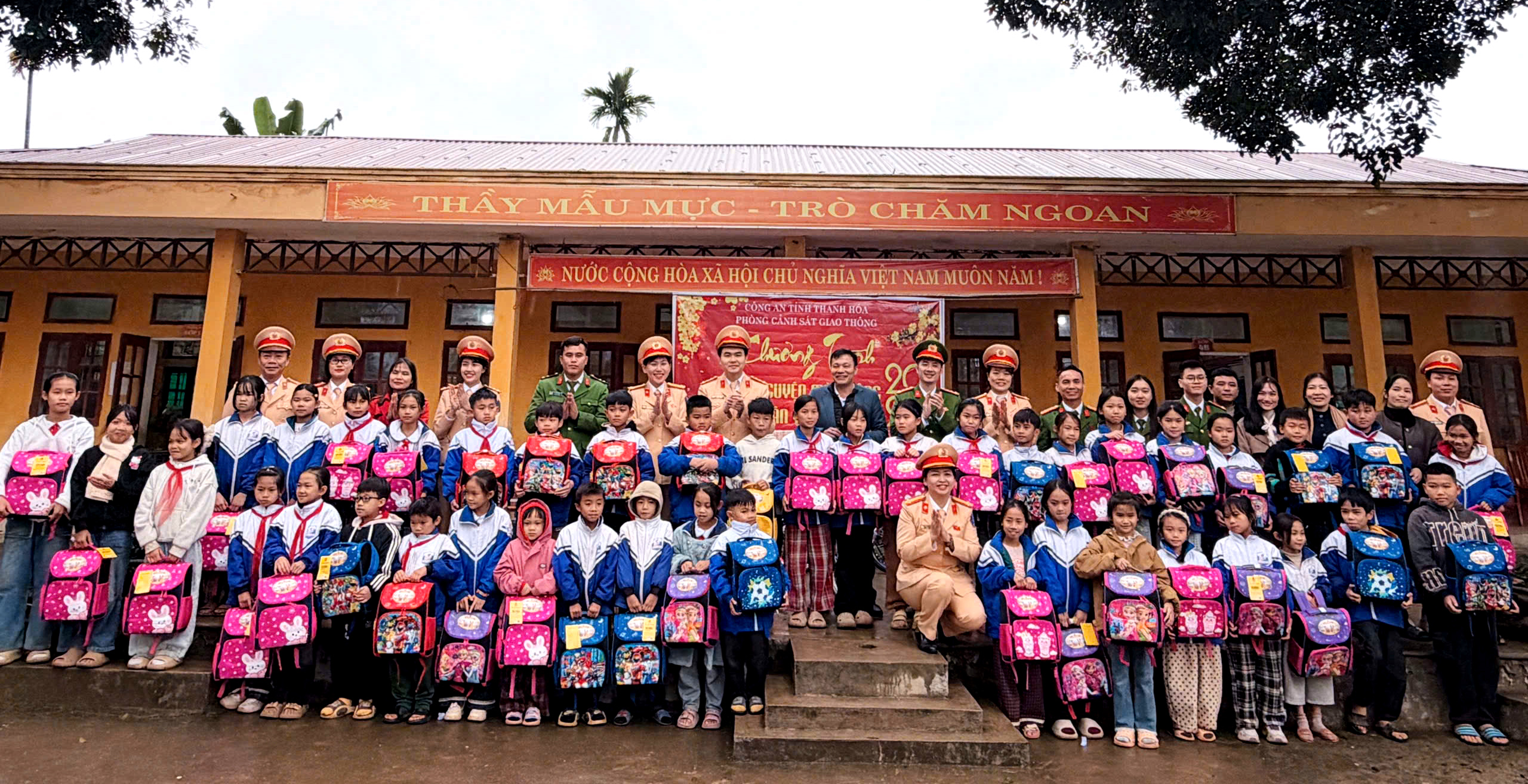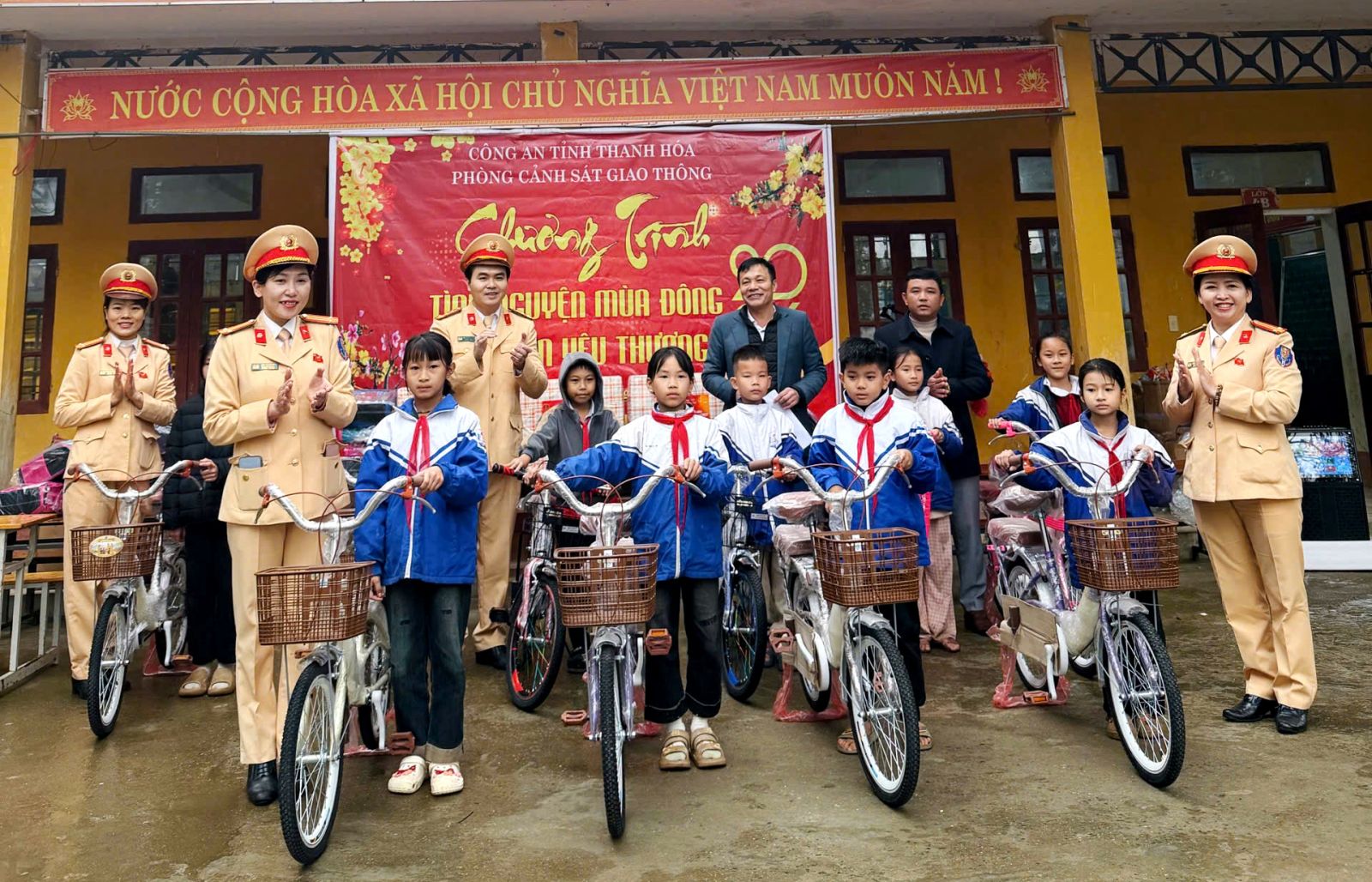 Cùng với công tác tuyên truyền, Phòng Cảnh sát giao thông đã trao tặng 520 suất bánh kẹo, 90 phần quà gồm ba lô, vở, bút màu cho học sinh có hoàn cảnh khó khăn, nỗ lực vươn lên trong học tập; trao tặng 10 xe đạp cho học sinh có hoàn cảnh đặc biệt khó khăn, đạt thành tích học tập tốt và 50 mũ bảo hiểm cho cán bộ, giáo viên nhà trường.